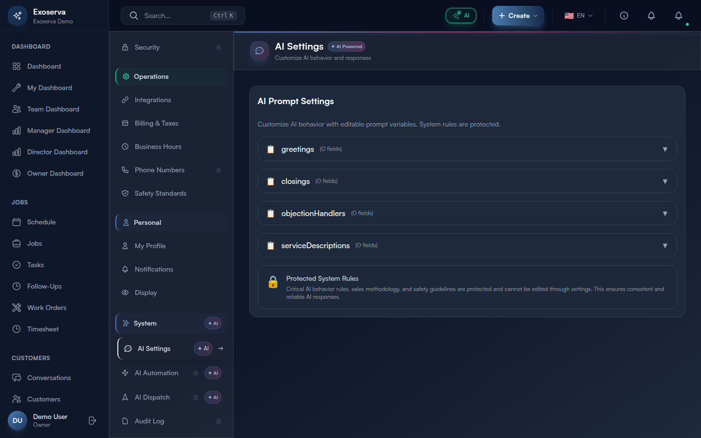 Navigate to the AI Settings Hub (sidebar Settings then AI Settings under System) to find the prompt customization section. The Global Settings panel provides fields for: System Prompt (the base instructions the AI follows when interacting with customers and generating suggestions), Business Context (a free-text field where you describe your services, service area, and customer communication style), and Language Preference plus Timezone (which control how the AI formats dates, currency, and messages). Edit any field and click “Save Settings” at the bottom of the panel. The AI applies your changes to all future interactions immediately.