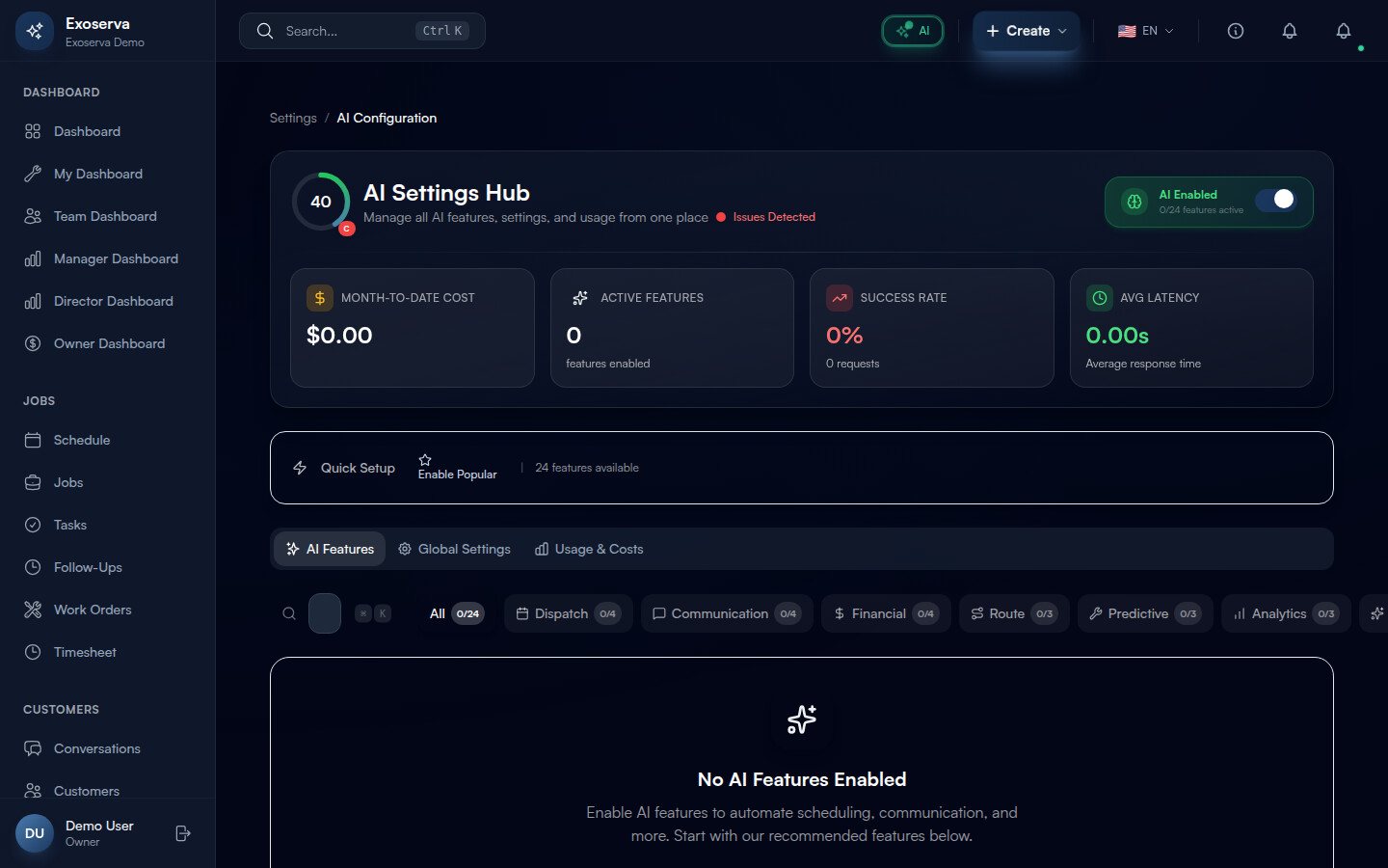 Exoserva uses AI to automate routine tasks, suggest optimal scheduling, and provide predictive insights. The AI Automation settings let you control which AI features are active, customize AI behavior, and monitor AI usage costs. This guide walks you through configuring AI automation for your business.