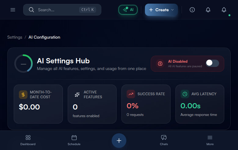 There is also a clever feature for when you are scrolling down this page: when the hero section (the big overview area at the top) scrolls off screen, a compact sticky header pins itself to the top of your browser window. Think of it like a toolbar that follows you as you scroll. This sticky header shows the essential controls in a condensed form: a brain icon (green when AI is enabled, red when disabled), the page title, an enabled/disabled status badge, how many features are active (like “12/18 active”), your month-to-date cost, and the master AI toggle switch. This means you can always see the AI status and turn it on/off without scrolling all the way back to the top.
