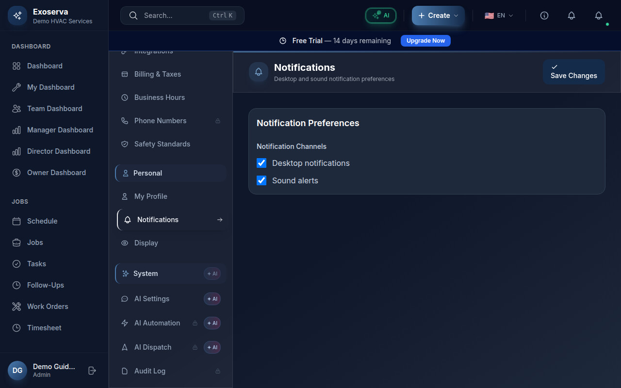 Tip: If you are a business owner, keep Payments and Alerts enabled on all channels. Knowing immediately when a payment comes in or an invoice goes overdue can save you from cash flow surprises. Technicians in the field usually benefit most from Jobs and Reminders enabled with SMS and Badge channels.