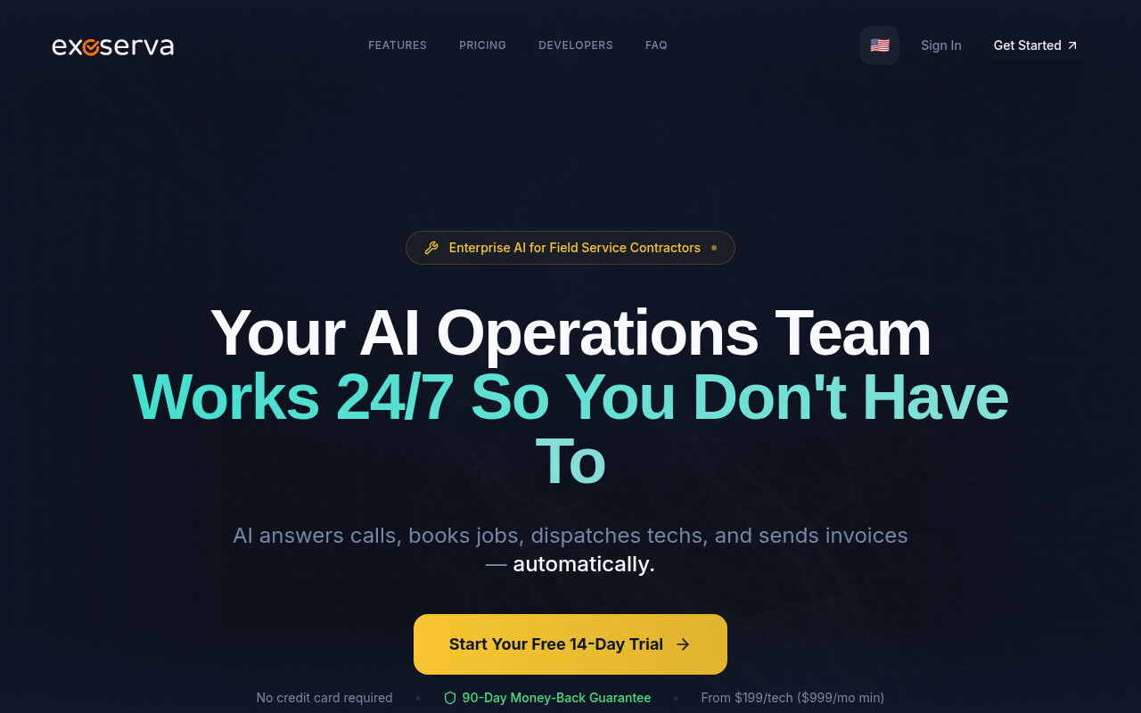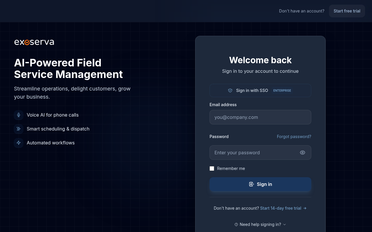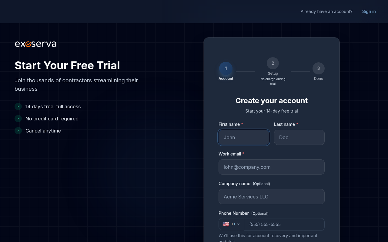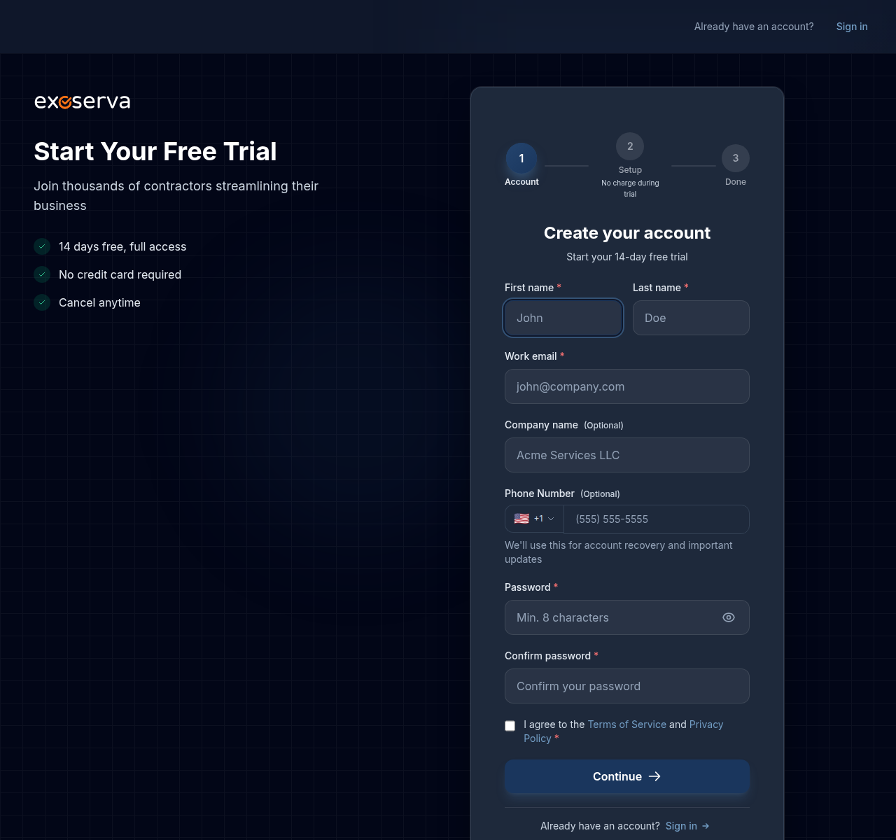 Welcome to Exoserva! This guide walks you through creating your account so you can start managing your field service business with AI-powered tools. The signup process takes just a few minutes and includes a free 14-day trial with full access to all features – no credit card required.