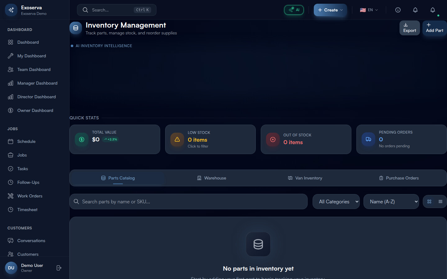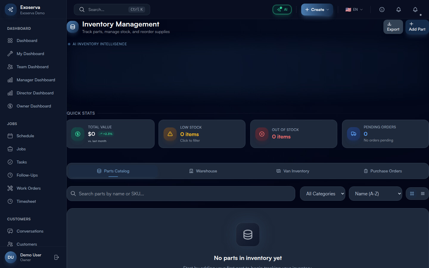 Tracking your parts and materials inventory prevents costly delays on job sites. The Exoserva Inventory module lets you monitor stock levels, set low-stock alerts, and ensure technicians always have the parts they need. This guide covers adding items, tracking quantities, and managing stock alerts.