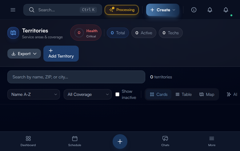 Warning: Each ZIP code should only appear in ONE active territory. If the same ZIP code is in two different territories, the AI dispatch system will get confused about which territory a job belongs to, and you will end up with inconsistent routing. Before creating a new territory, check that your ZIP codes do not overlap with existing ones.
