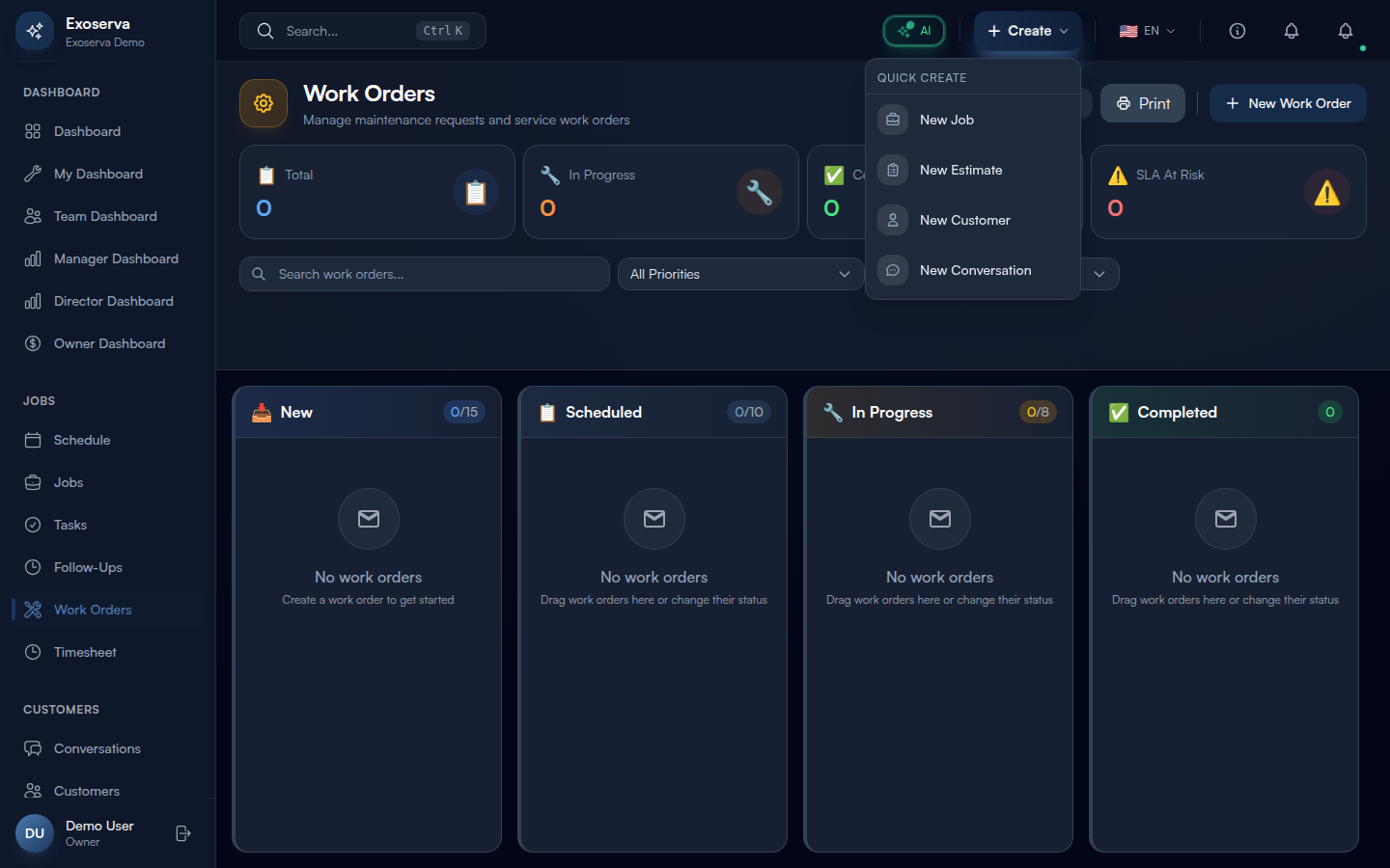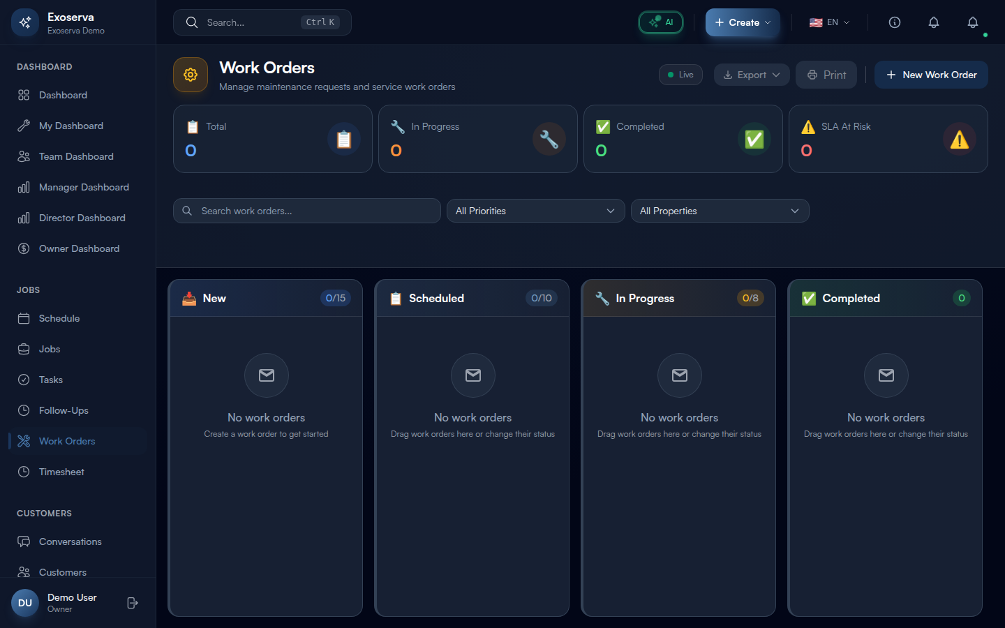 Tip: Click any stat card to quickly filter the Kanban board to that category. For example, clicking the red “SLA At Risk” card filters to show only work orders that need immediate attention.