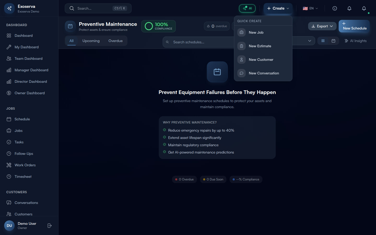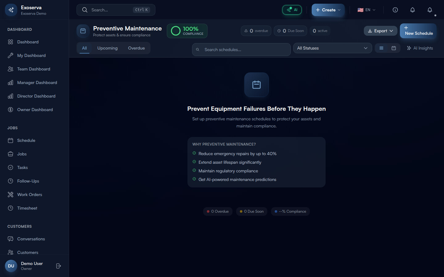 Preventive maintenance keeps equipment running and reduces emergency repair calls. Exoserva lets you create recurring maintenance schedules that automatically generate jobs when service is due. This guide walks you through setting up, managing, and monitoring your preventive maintenance program.