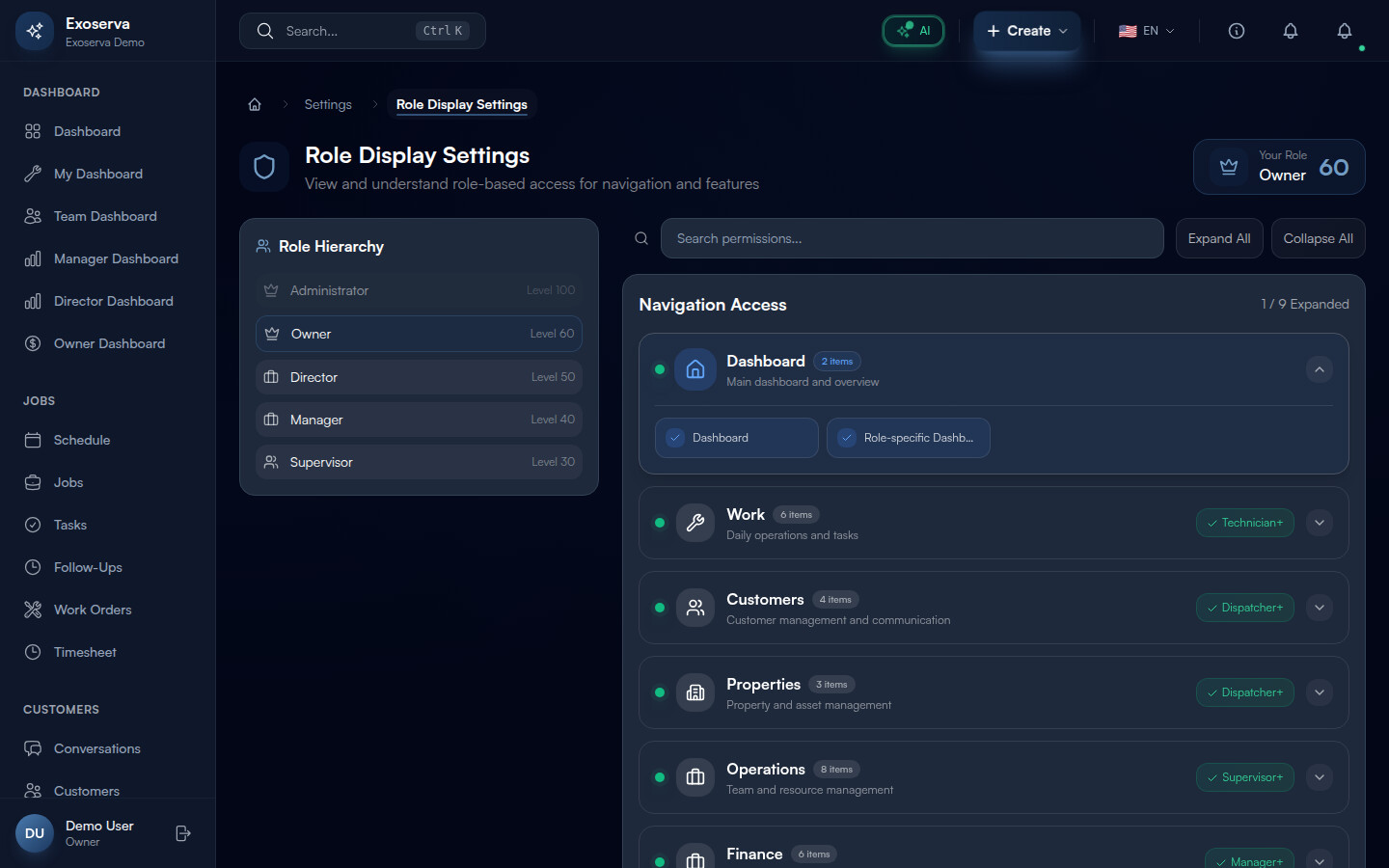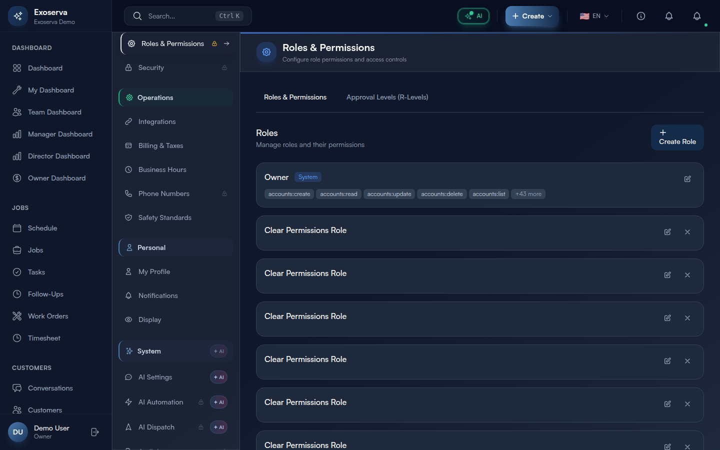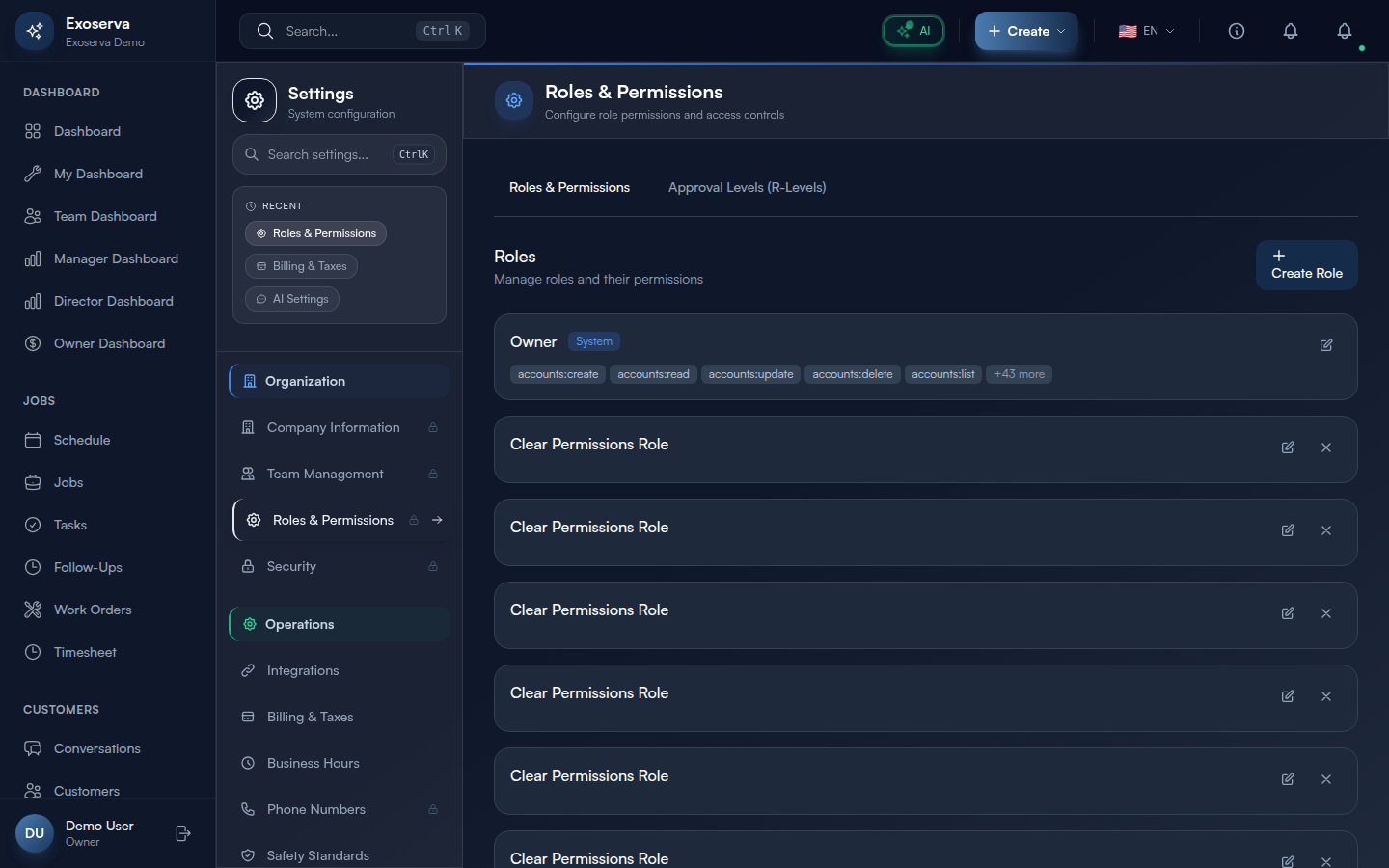 Tip: Start with the built-in roles before creating custom ones. They cover the most common team structures in field service businesses and are maintained by Exoserva to include appropriate default permissions for new features.