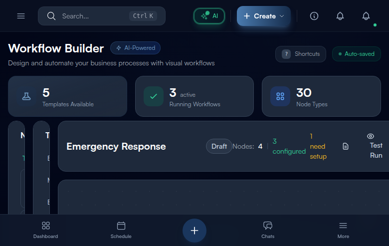 At the top, you will see the title “Workflow Builder” with an “AI-Powered” badge (bolt icon – meaning your workflows can use AI to make smart decisions). A subtitle reads “Design and automate your business processes with visual workflows.” Notice the “?” keyboard shortcut hint – press it to see all available shortcuts. A green pulsing “Auto-saved” indicator tells you your work is saved continuously.
